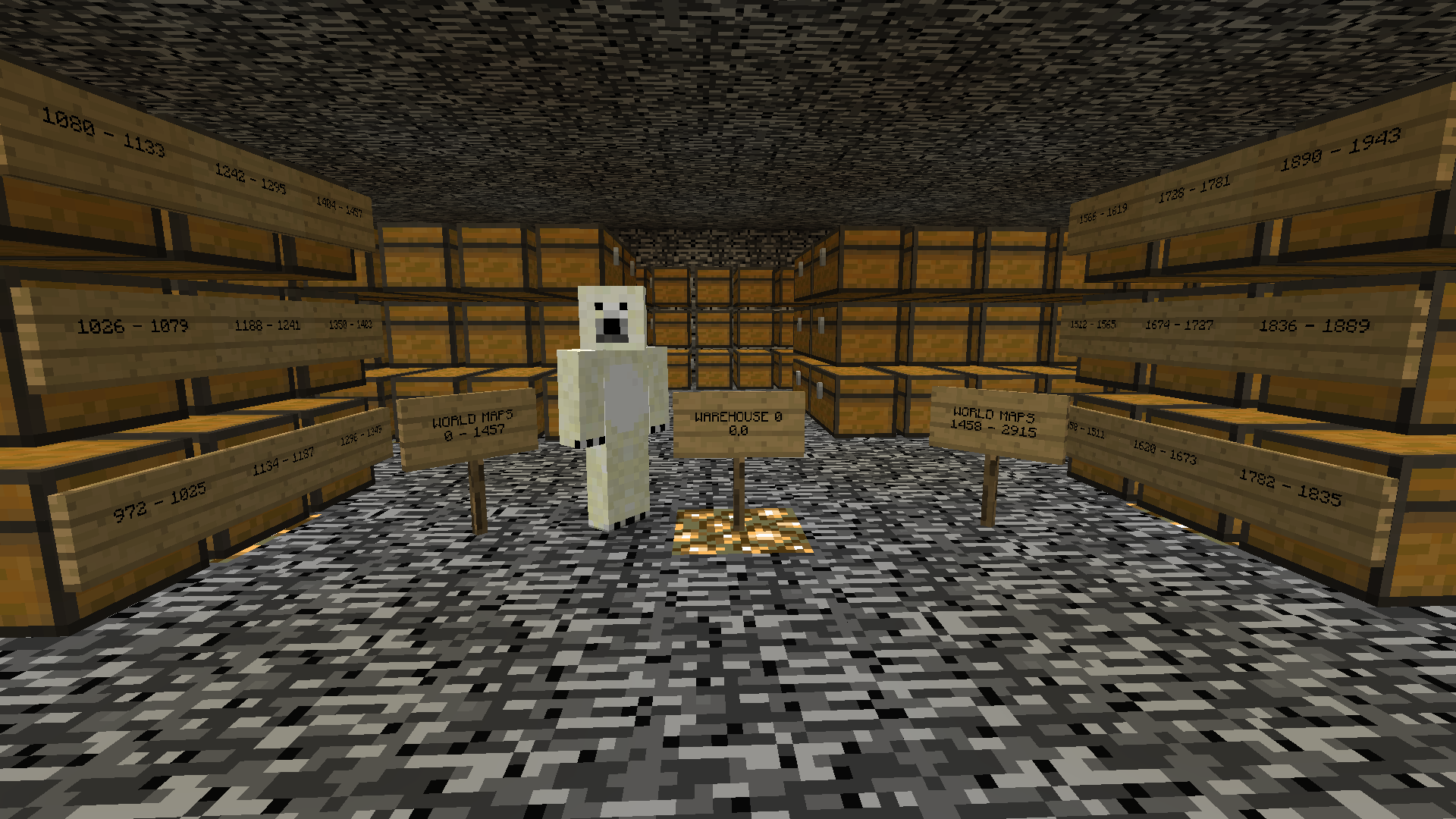 Perry and I began working on our Map Room today. I took some pictures of the progress. There’s also one of Perry posing in “Warehouse 0”. He built a storage facility to hold every map we’ve created, and located it at bedrock level at 0,0 (hence the name). Its insane.