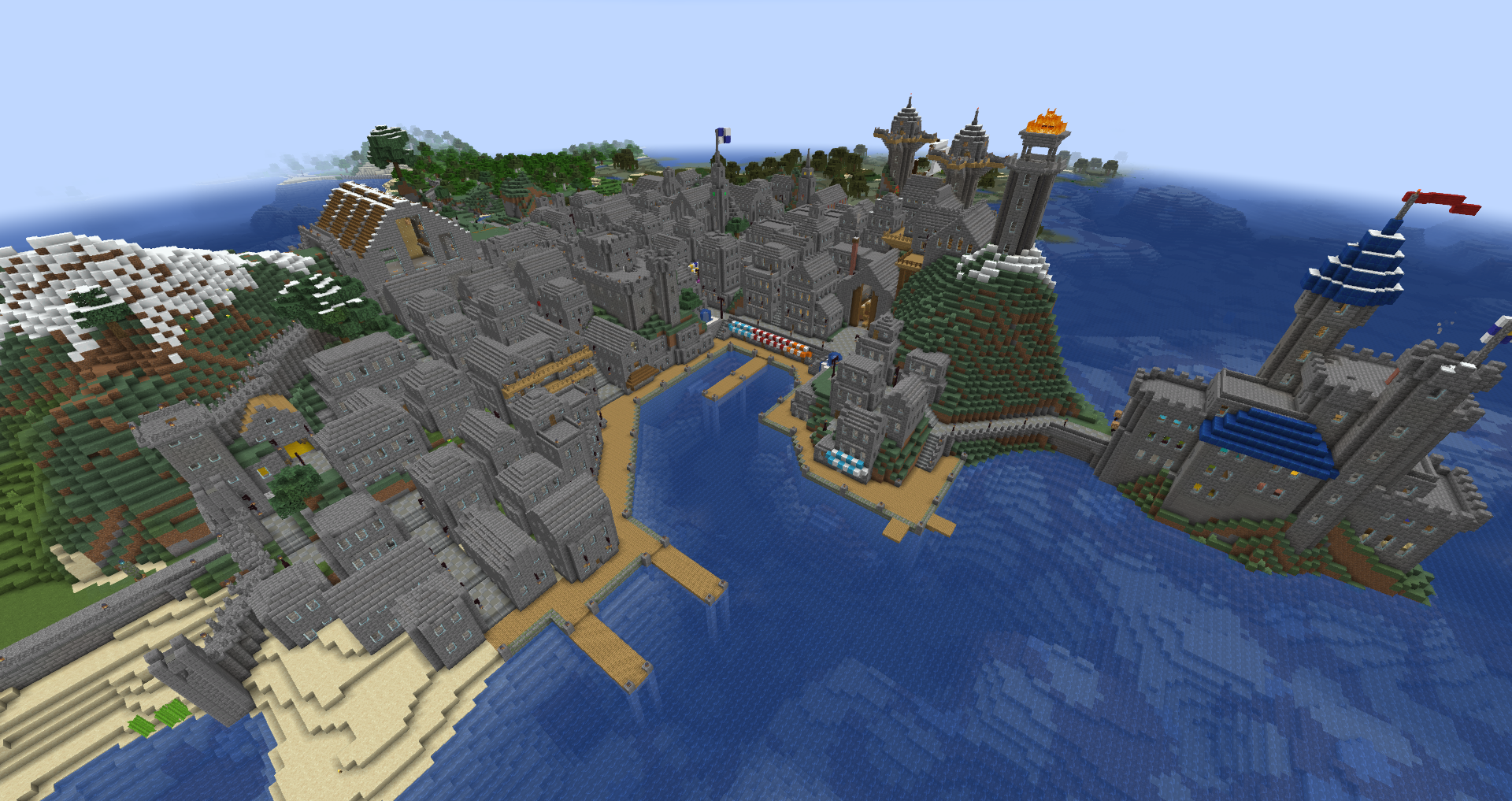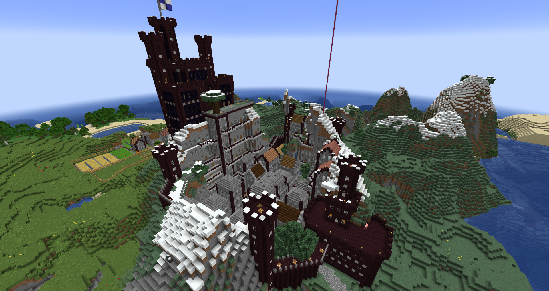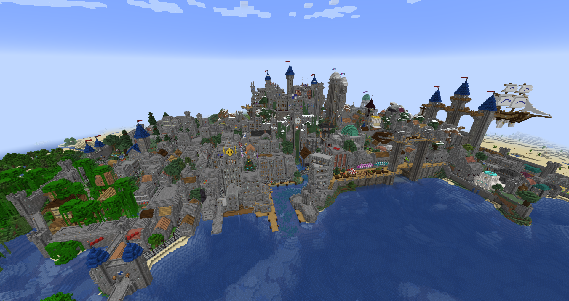 Construction on Denbar began the first day I had Minecraft, in April 2012. The first structure I built was a small castle on an intense bit of mountain. It grew and grew and grew until it became what is now Cair Denbar, the home of the Emperor. What started as a small castle, is now a massive castle complex that spans three adjacent mountaintops. A small village that started north of the castle has now become my largest single build, Imperial City. It includes the Cair Denbar complex, a massive Cathedral, marketplace, harbor, and an ever-growing Skyport (my world has airships).