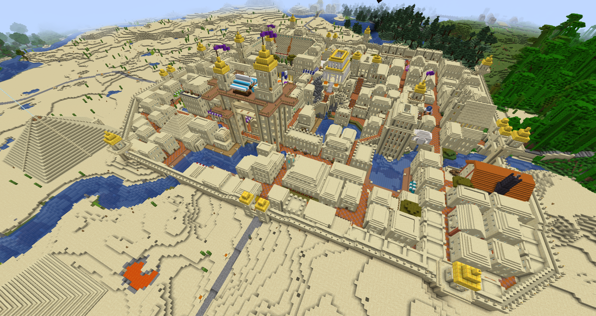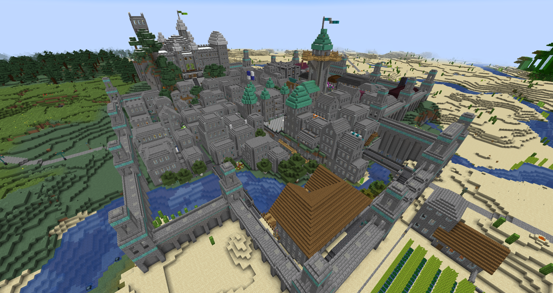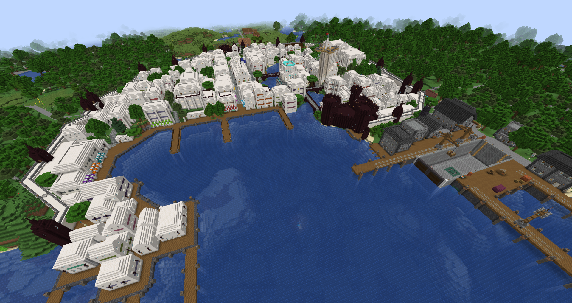Construction on Denbar began the first day I had Minecraft, in April 2012. The first structure I built was a small castle on an intense bit of mountain. It grew and grew and grew until it became what is now Cair Denbar, the home of the Emperor. What started as a small castle, is now a massive castle complex that spans three adjacent mountaintops. A small village that started north of the castle has now become my largest single build, Imperial City. It includes the Cair Denbar complex, a massive Cathedral, marketplace, harbor, and an ever-growing Skyport (my world has airships).