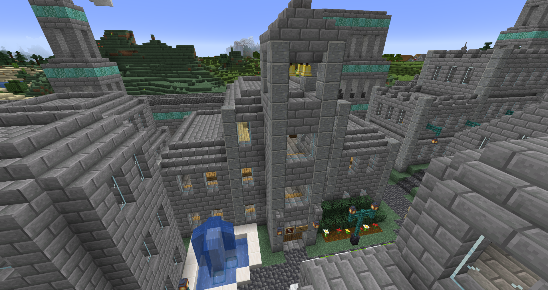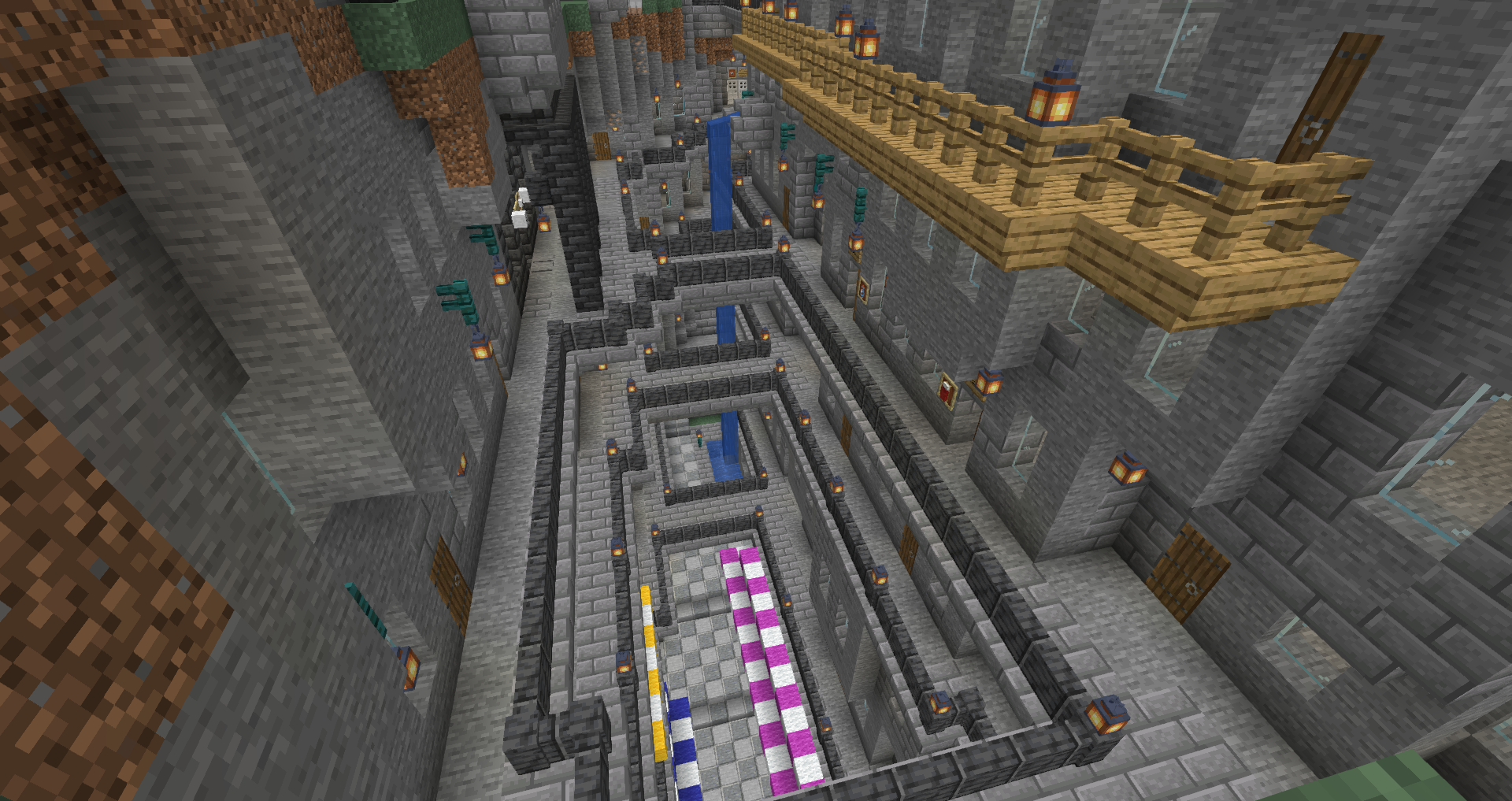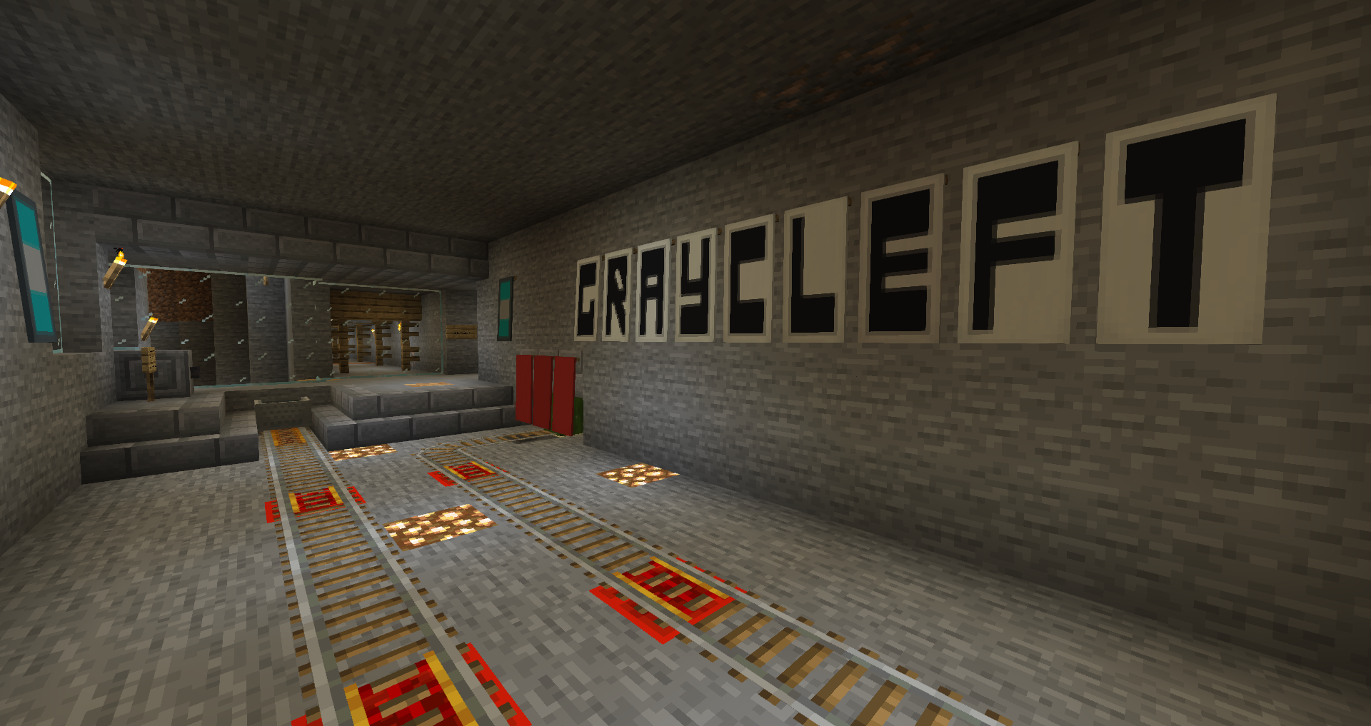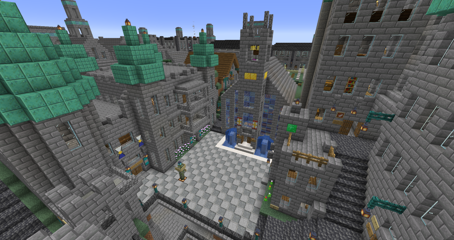 For the 5th Anniversary of Alpha, I decided to bring Graycleft up-to-date. It was feeling a bit old, as most of the buildings were smaller and looked dingy in comparison to my more modern builds. I overhauled most of the surface buildings, built a new city-wall, and expanded the city again to fill in the area created by the new square city walls. I also added a railway station that connects the lowest level of Graycleft to The Deep.
