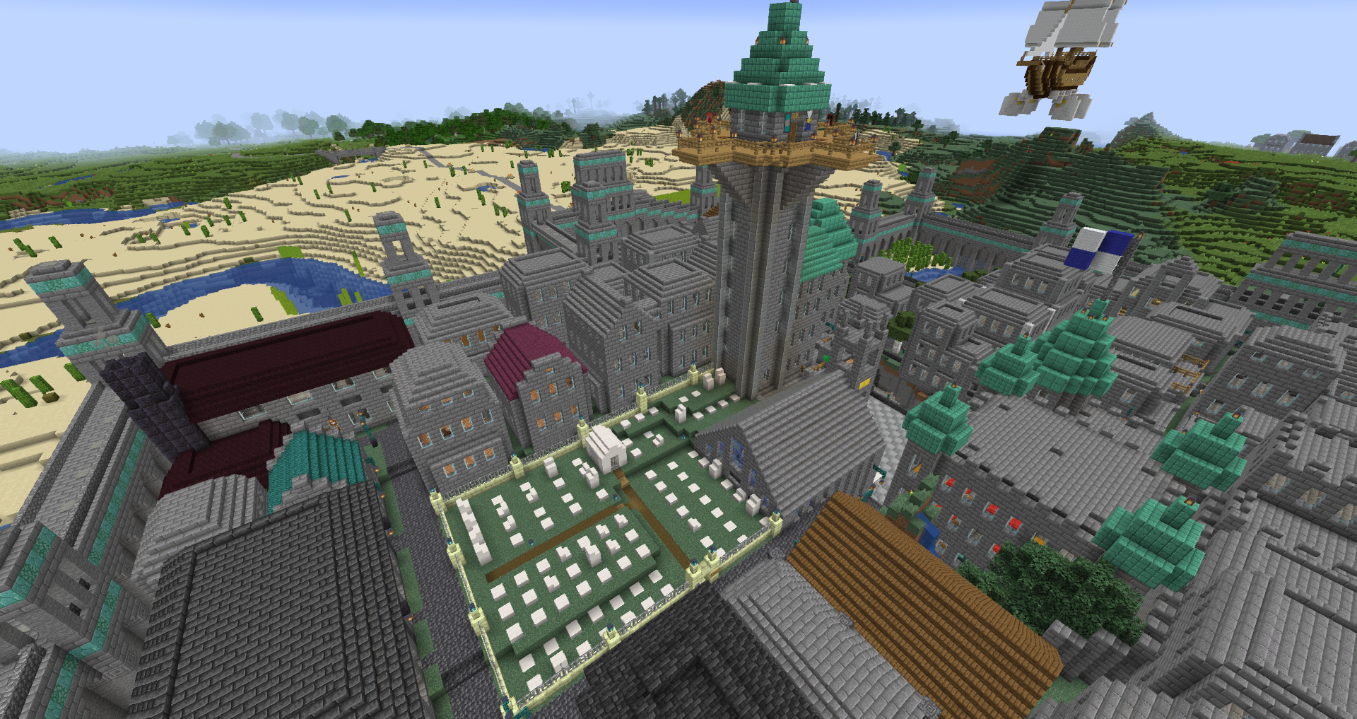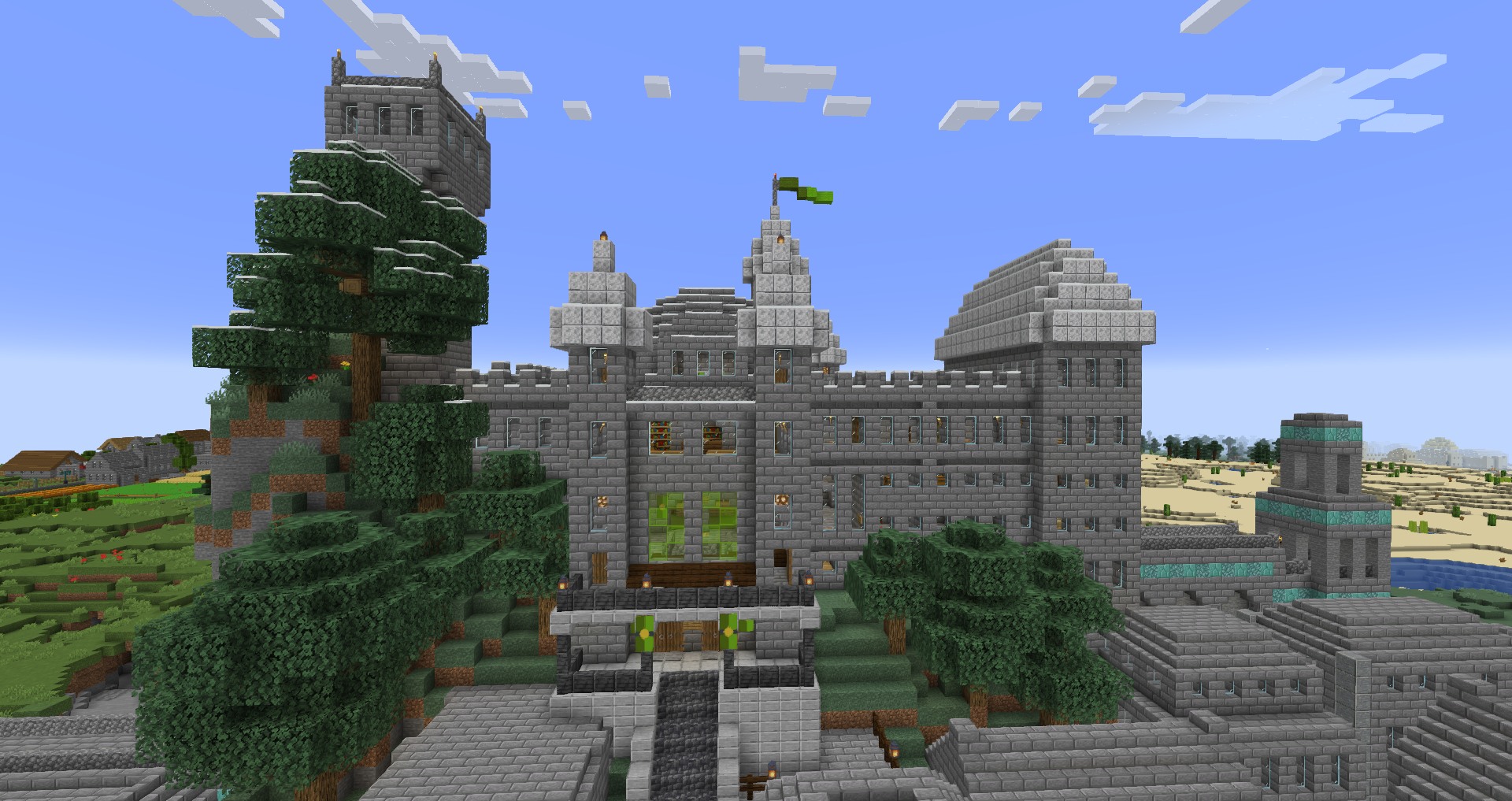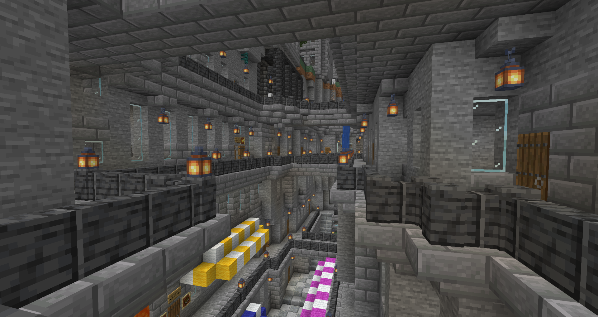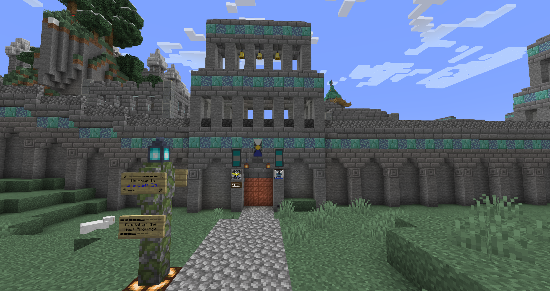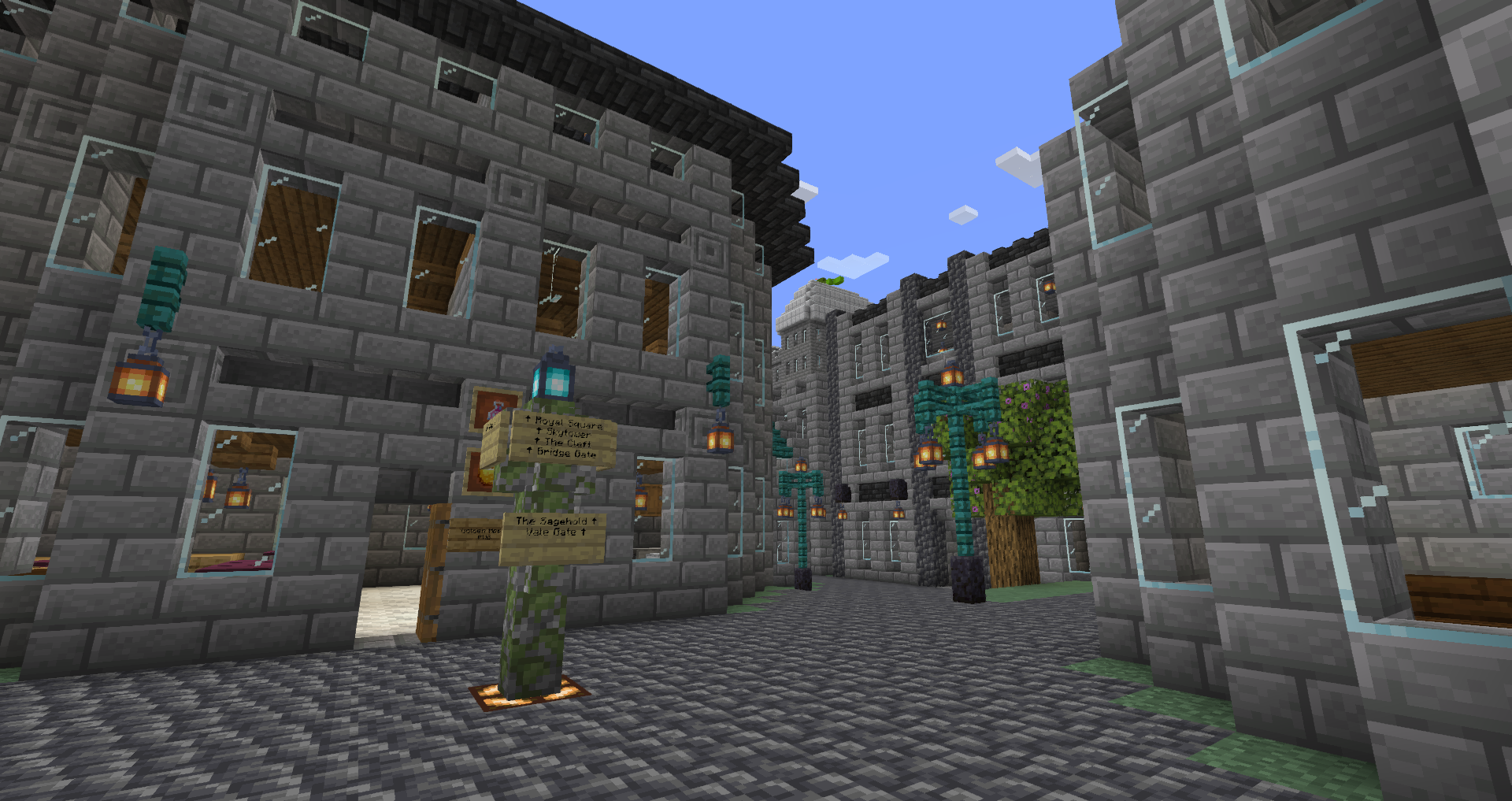 For the 5th Anniversary of Alpha, I decided to bring Graycleft up-to-date. It was feeling a bit old, as most of the buildings were smaller and looked dingy in comparison to my more modern builds. I overhauled most of the surface buildings, built a new city-wall, and expanded the city again to fill in the area created by the new square city walls. I also added a railway station that connects the lowest level of Graycleft to The Deep.