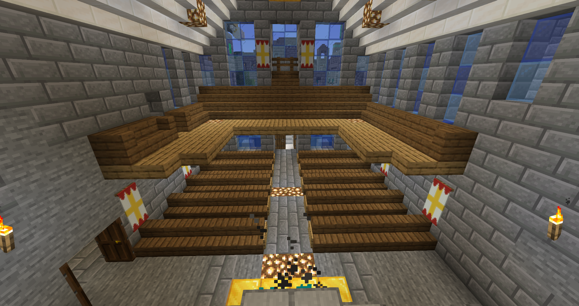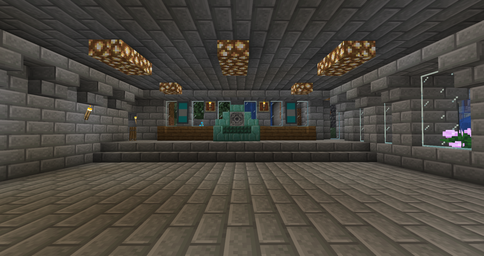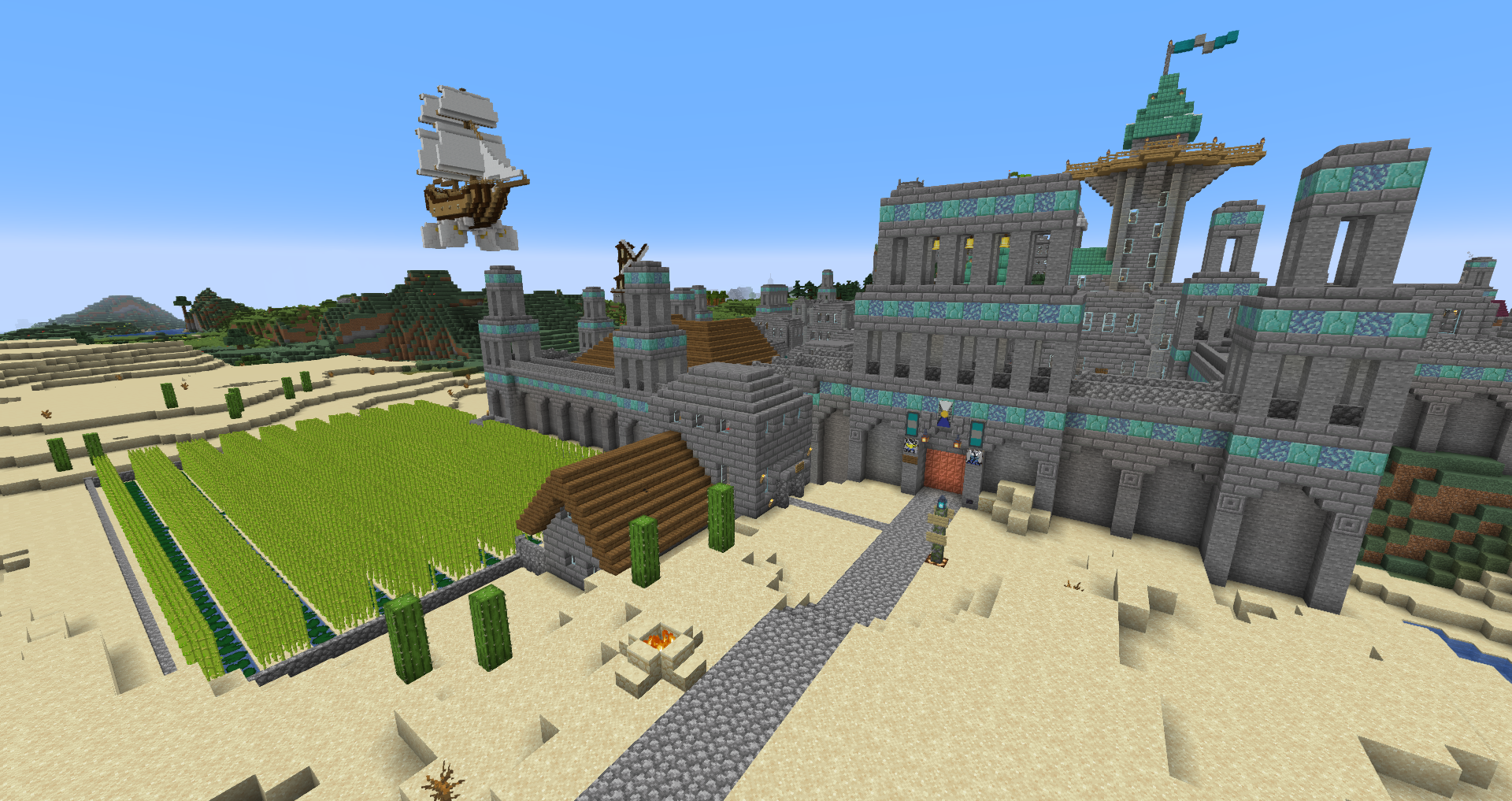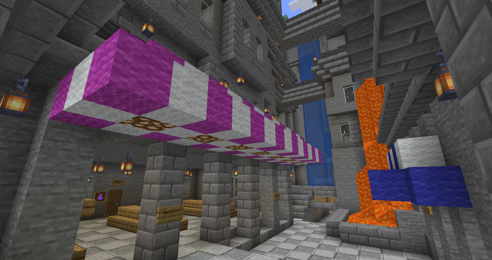 For the 5th Anniversary of Alpha, I decided to bring Graycleft up-to-date. It was feeling a bit old, as most of the buildings were smaller and looked dingy in comparison to my more modern builds. I overhauled most of the surface buildings, built a new city-wall, and expanded the city again to fill in the area created by the new square city walls. I also added a railway station that connects the lowest level of Graycleft to The Deep.